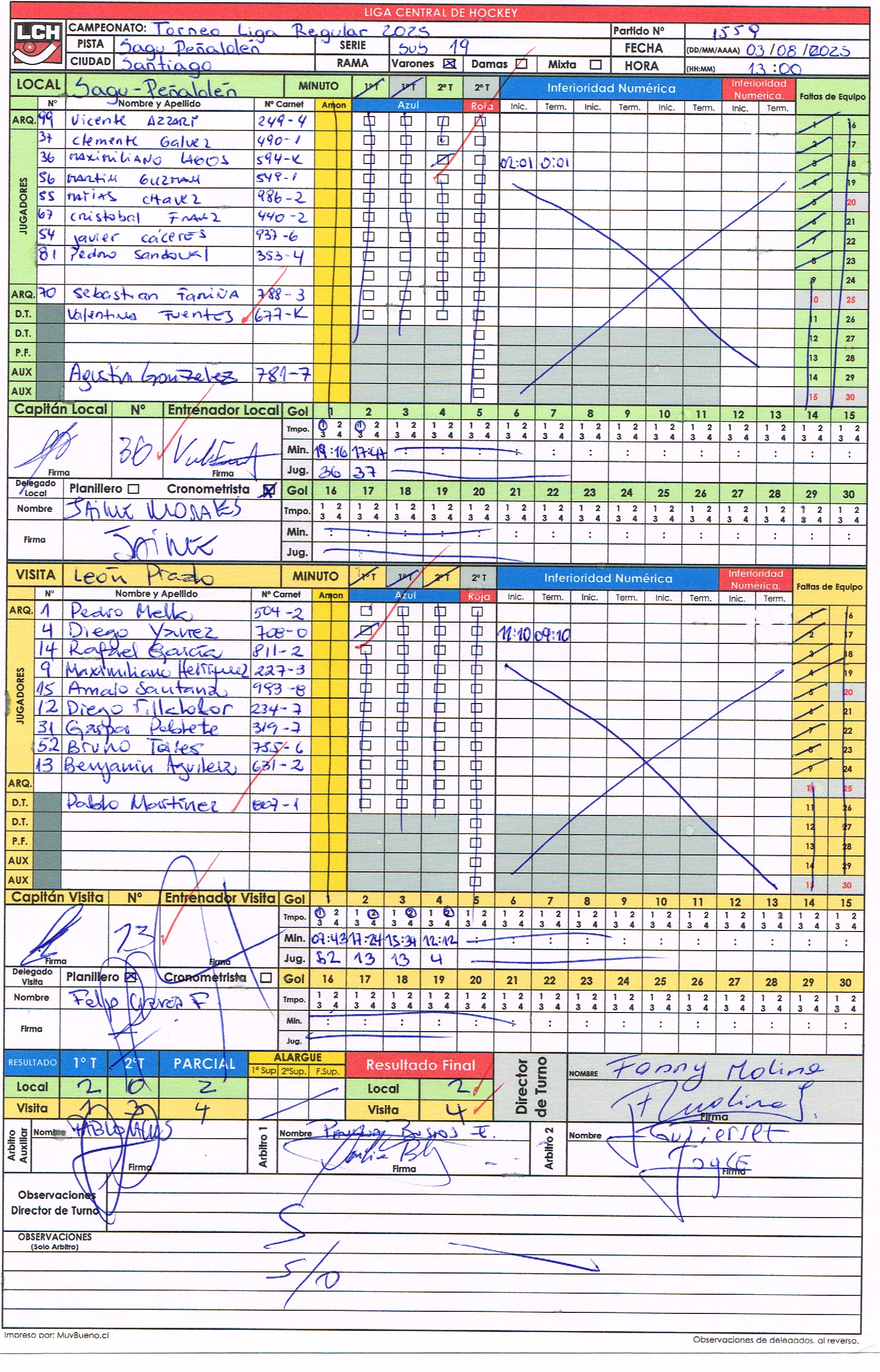 1-1559 03/08/2025 13:00 Sagu-Peñalolén Sagu-Peñalolén 2 - 4 León Prado León Prado Finalizado Grupo 📄